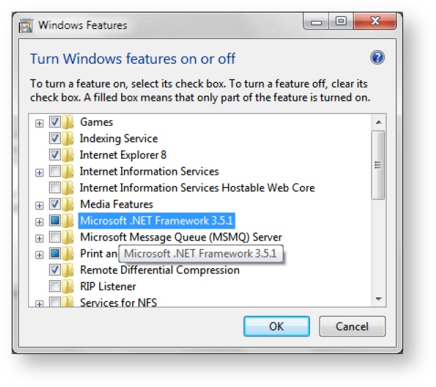 - Select "Microsoft .NET Framework 3.5.1" and click OK