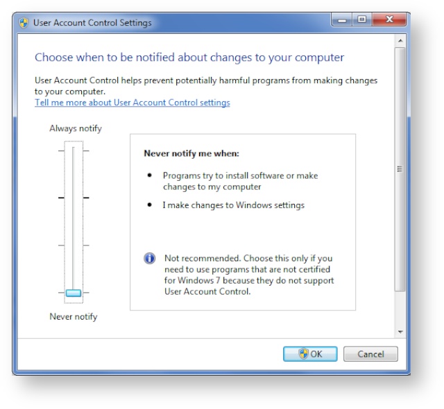 - Click on the link to "Change User Account Control Settings"